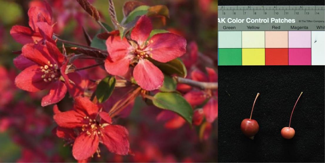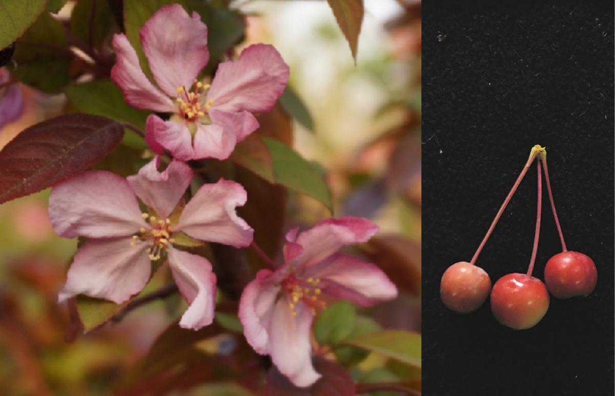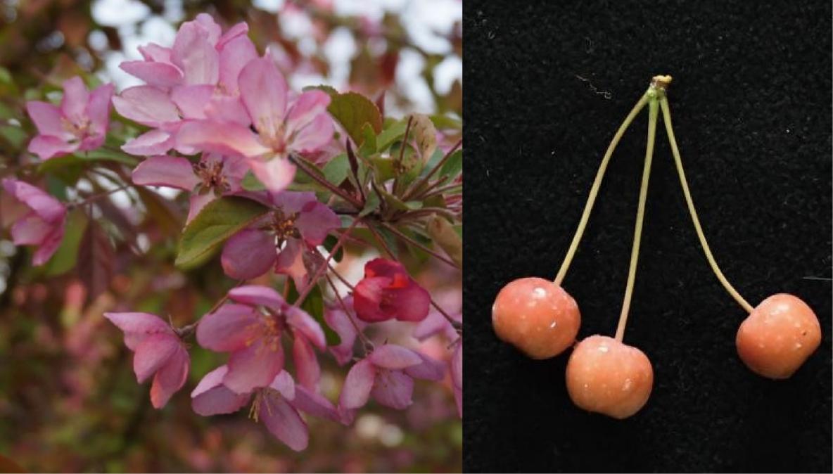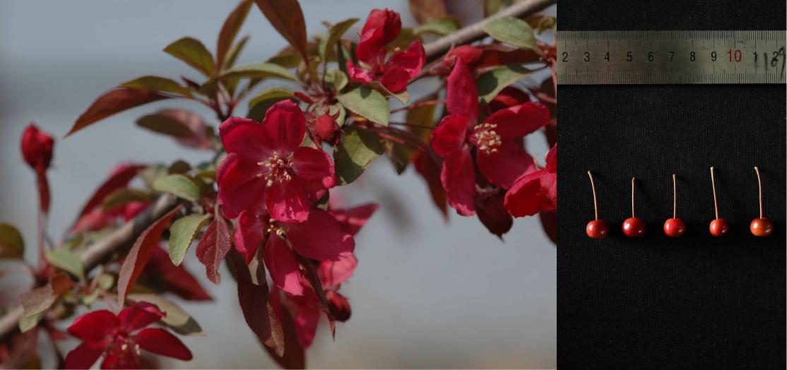 ‘皇家雨丝’(品种权号20251006):花紫粉色,花瓣窄卵形,相互分离。枝条微下垂。果实中小型,深红色。其花、果、叶皆具观赏性,是优秀的四季景观树种。