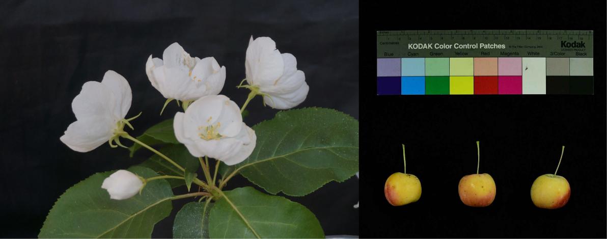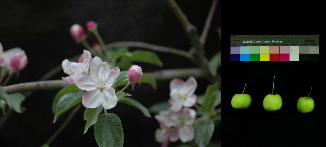 ‘岱凤’(品种权号20251017):树势中庸,树冠开张。果实性状突出,果形扁圆,果个显著大于多数观赏海棠,成熟时为鲜明的黄绿色,观赏期持久。花浅粉色,花瓣边缘波状,是优异的观果品种。