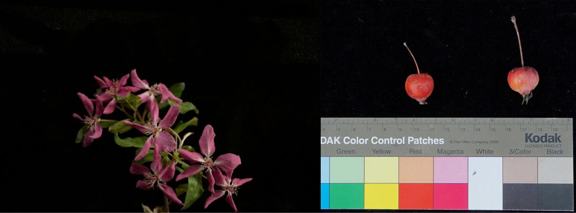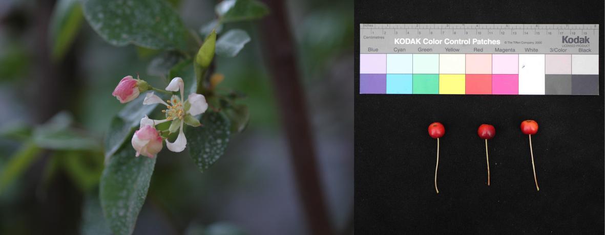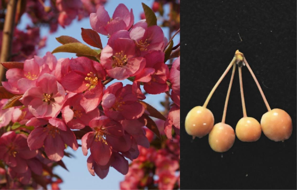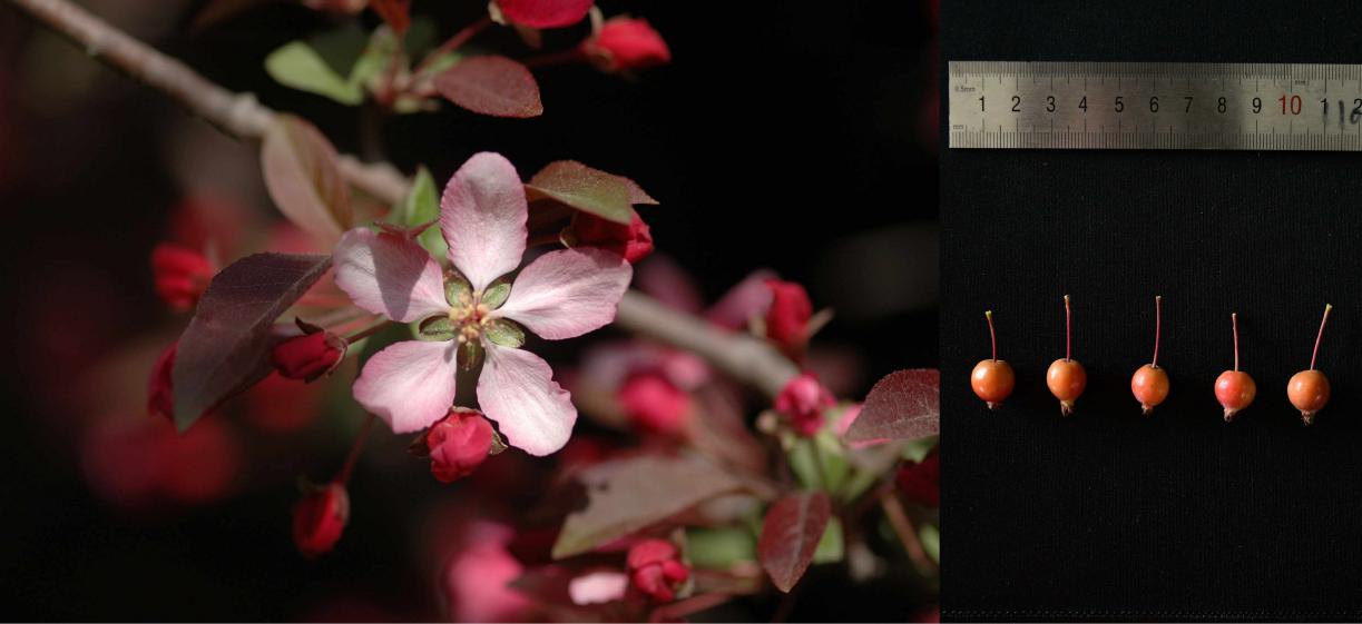 ‘岱呈’(品种权号20251018):花浅粉色,花径较大,花瓣边缘波状。果实小,近圆形,成熟时为明亮的橘黄色,色泽鲜艳纯净,宿存枝头时间长,深秋与冬季观赏价值极高。