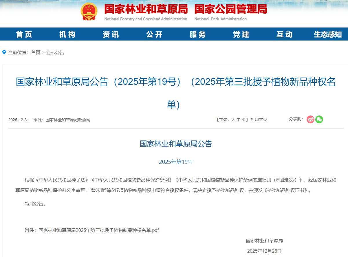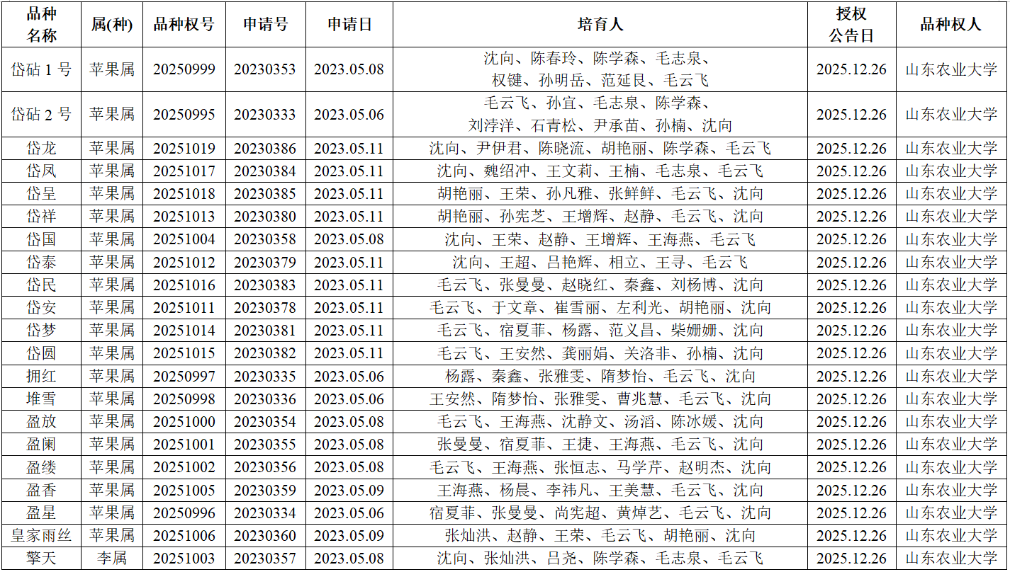 喜讯传来!近期,国家林业和草原局正式发布2025年第三批授予植物新品种权名单公告,我校园艺学院沈向、毛云飞团队培育的21个植物新品种成功获得国家授权。其中包括2个苹果砧木新品种、18个观赏海棠品种及1个李属山桃品种,既彰显了学校在植物育种领域的自主创新实力,更为我国园艺产业升级、生态景观提质提供了优质种质资源支撑。