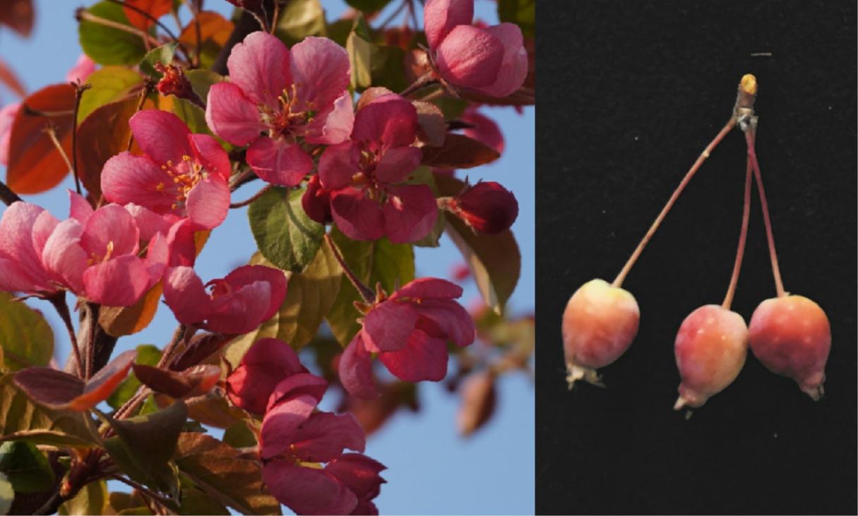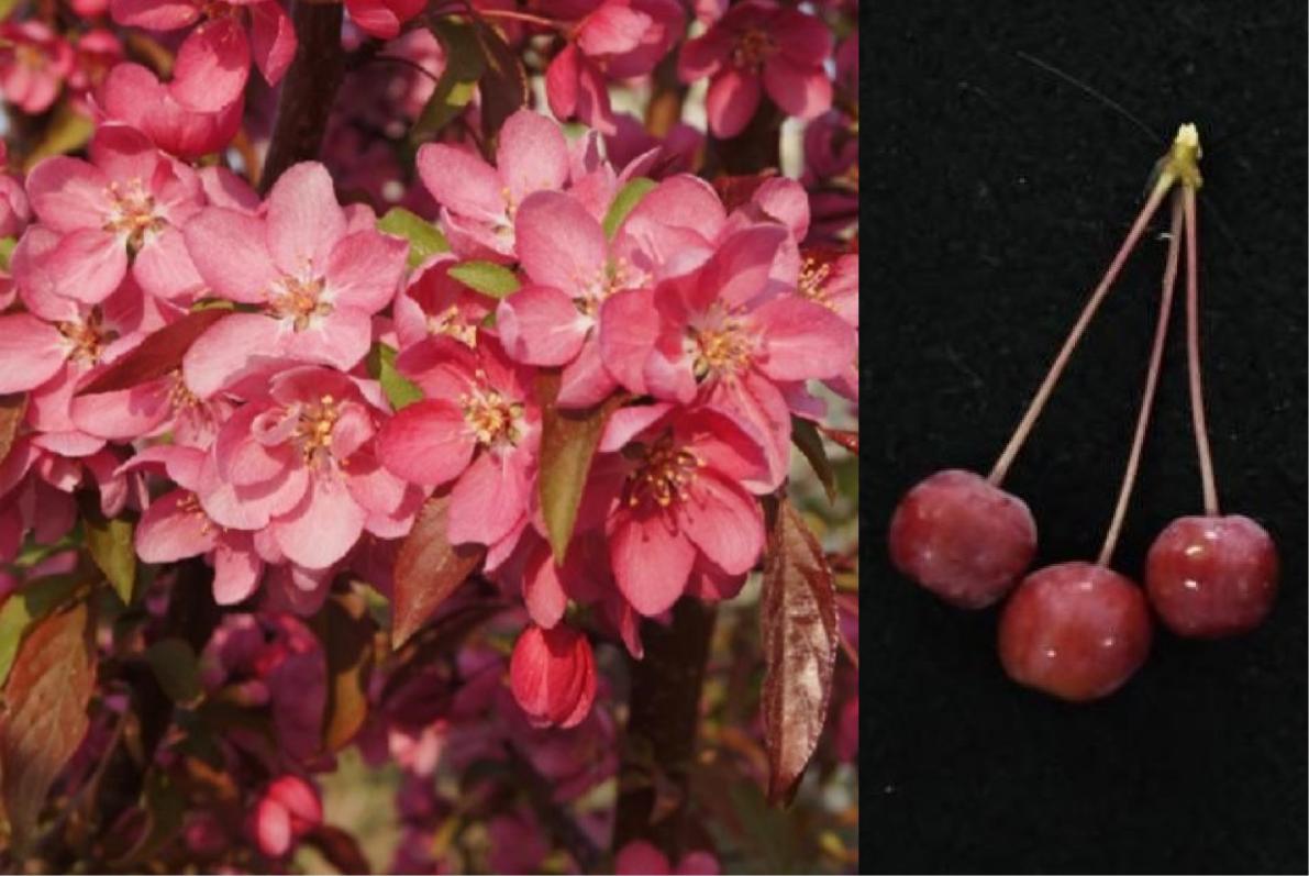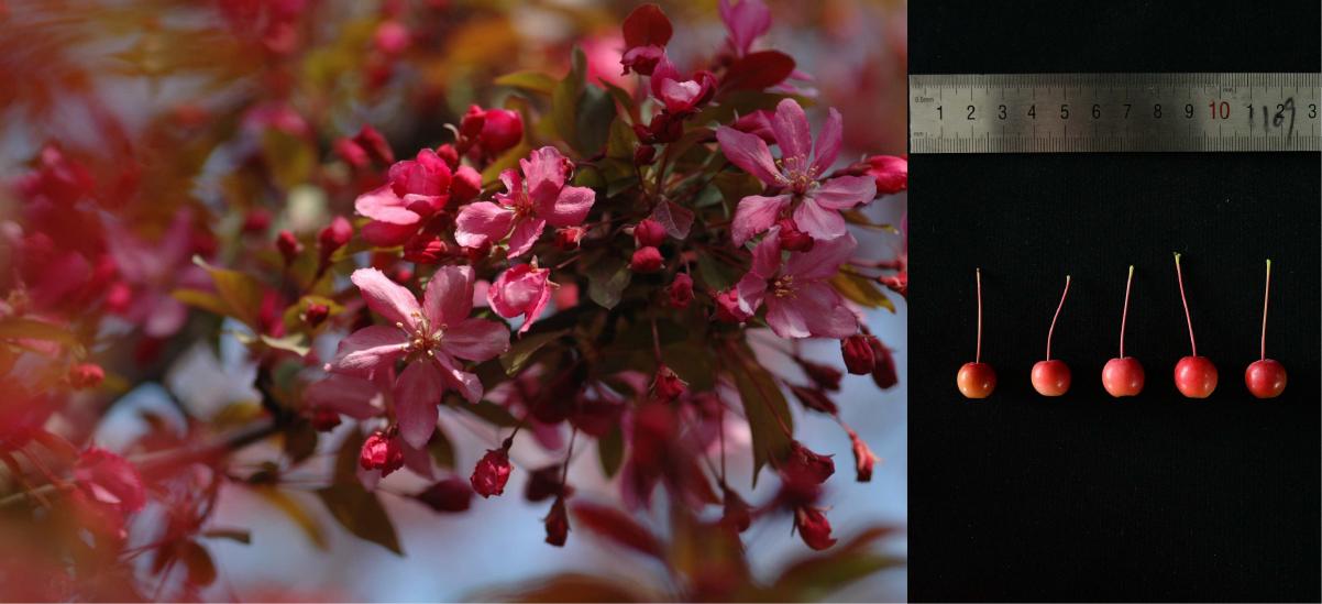 ‘岱安’(品种权号20251011):树形紧凑。花深粉色,花径较小,花瓣分离。叶片椭圆形,边缘锯齿钝,叶面平展,无裂刻。果实小、红色,着果密集,适合精细园林应用。