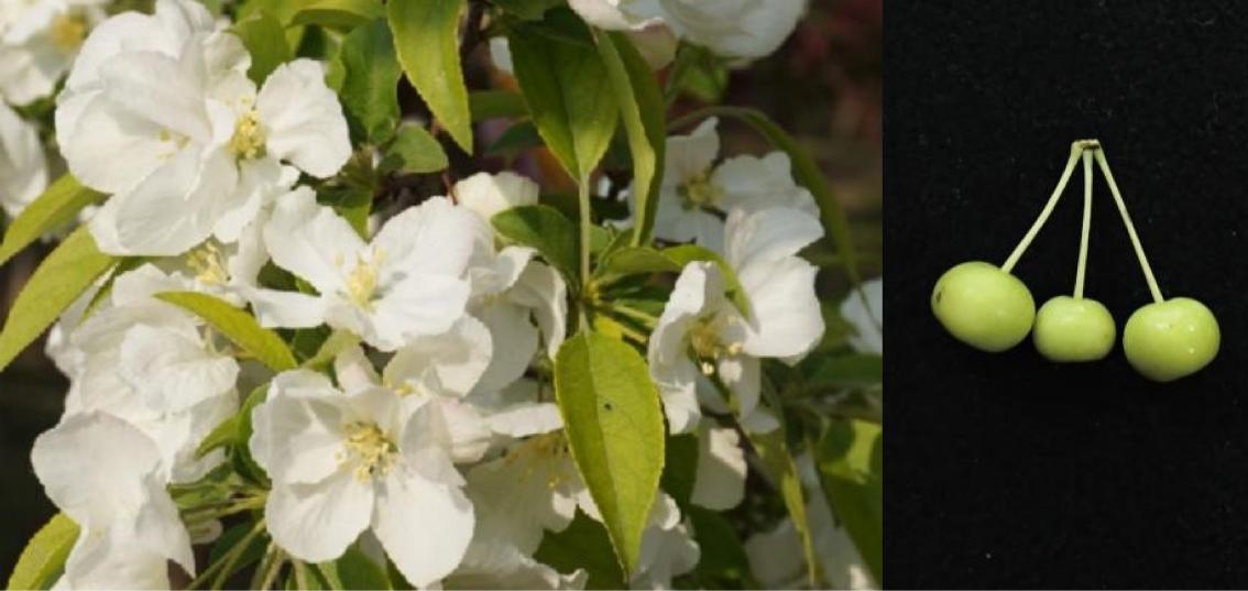 ‘岱祥’(品种权号20251013):树体较高,树冠呈窄卵形,枝条直立性强。花浅近白色,花瓣邻接。叶片长卵形,边缘具尖锐锯齿。果实中等大小,橘黄色带红晕,秋季景观效果突出。